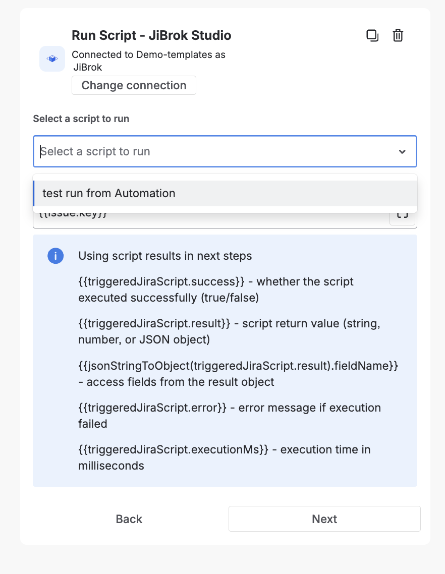 JiBrok Studio integrates with Jira Automation as a custom action. You can add the “Run JiBrok Studio Script” action to any automation rule to execute a script from your library.