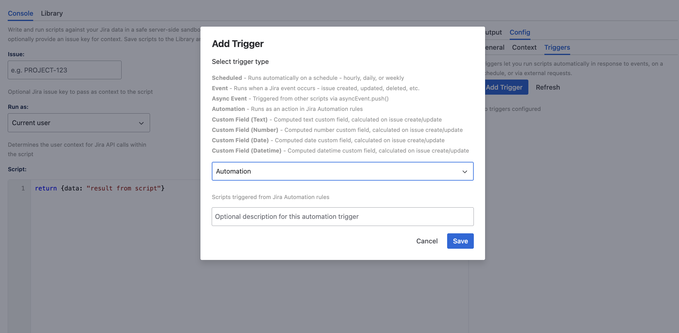 The script must be enabled and have an enabled Automation trigger to be available in Jira Automation.