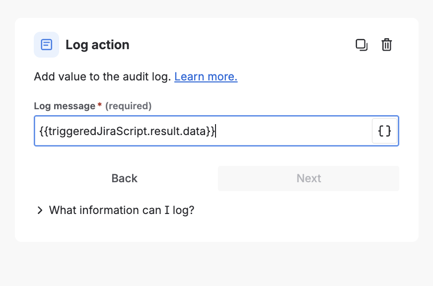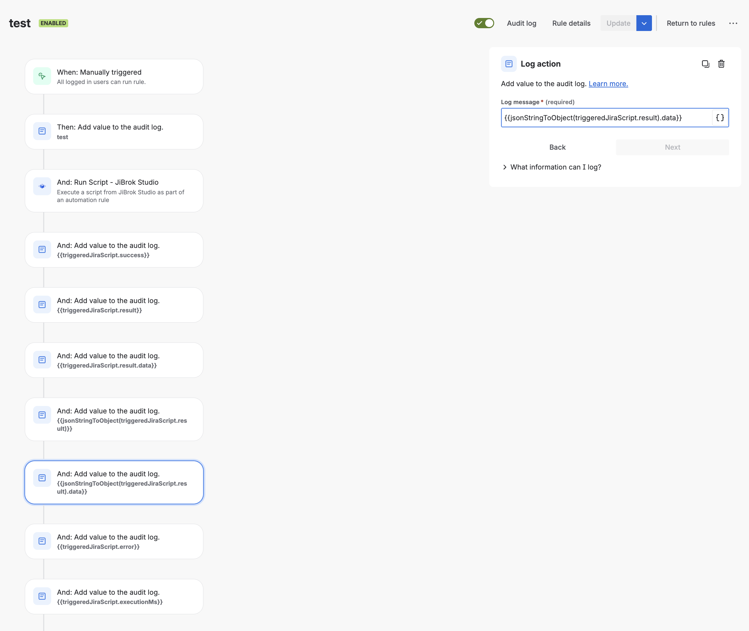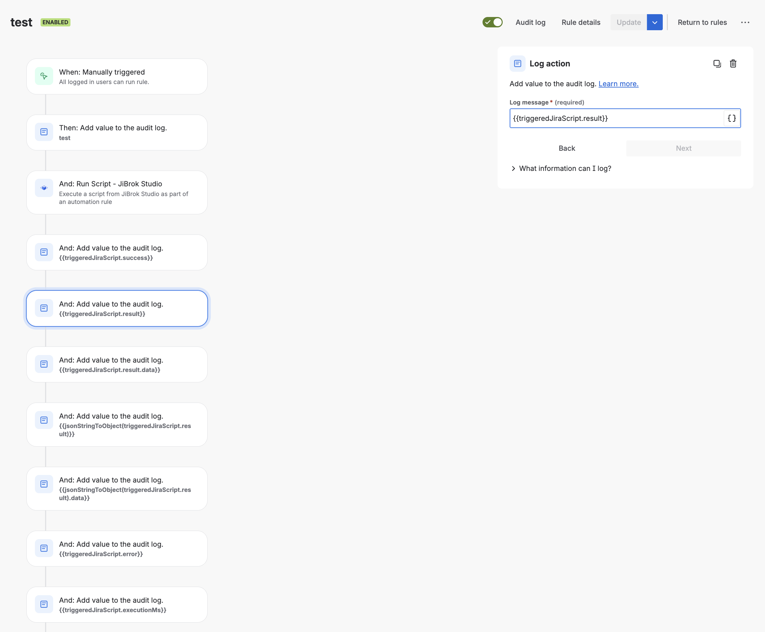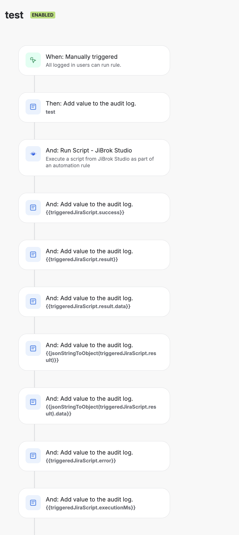 {{triggeredJiraScript.success}}equalstrue - Action: Log or send notification with