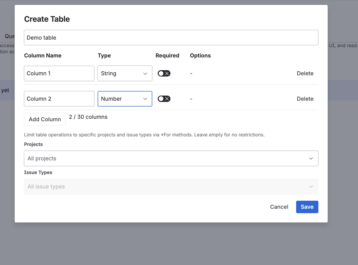 JiBrok Studio for Jira Cloud provides two data storage mechanisms: Custom Tables for persistent structured data and Message Queues for asynchronous message processing.