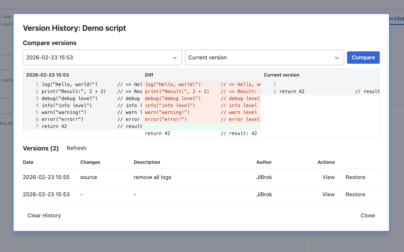 Select two versions to see a diff view highlighting what changed between them.