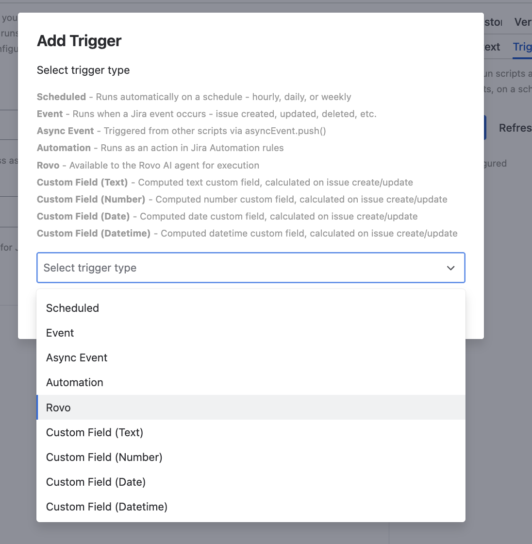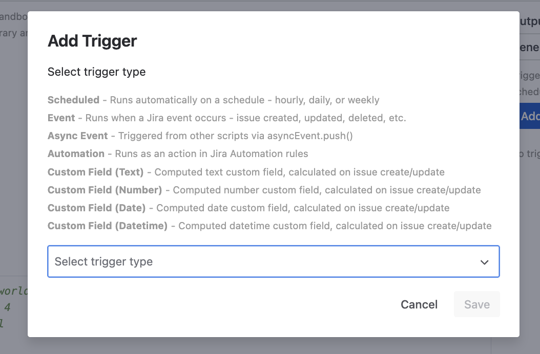 - Singleton triggers (Scheduled, Event, UIM, Scripted Fields, Async Event, Automation, Rovo): one per script