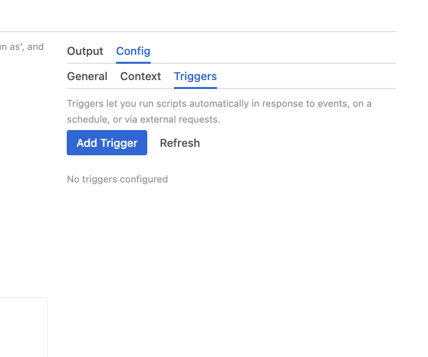 Triggers automate script execution in response to events, schedules, or user actions. Configure triggers in the script’s Config tab.